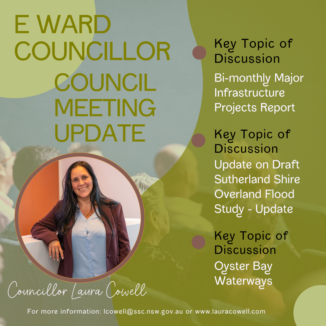 - The current draft Sutherland Shire Overland Flood Study process continue to progress in accordance with the Mayoral Minutes, Minute No. 228 of 6 November 2023 and Minute No. 251 of 11 December 2023, including: